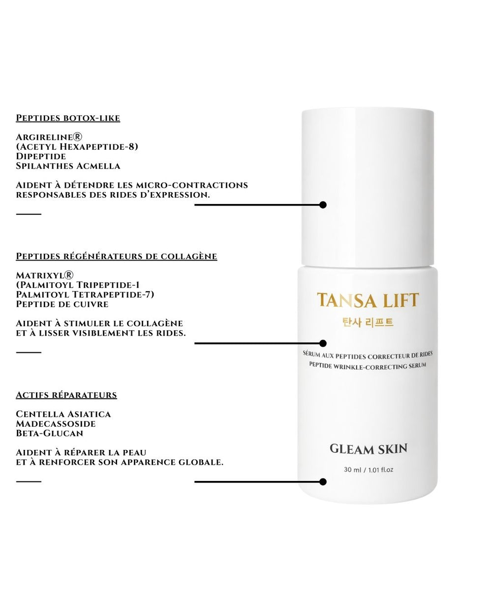 Tansa Lift est un sérum botox-like conçu pour lisser visiblement les traits, améliorer l’apparence des ridules et apporter un effet peau plus lisse et reposée.